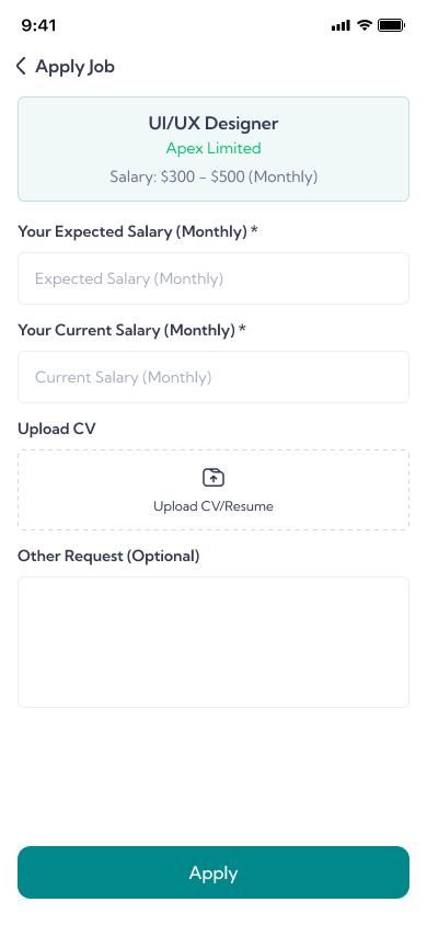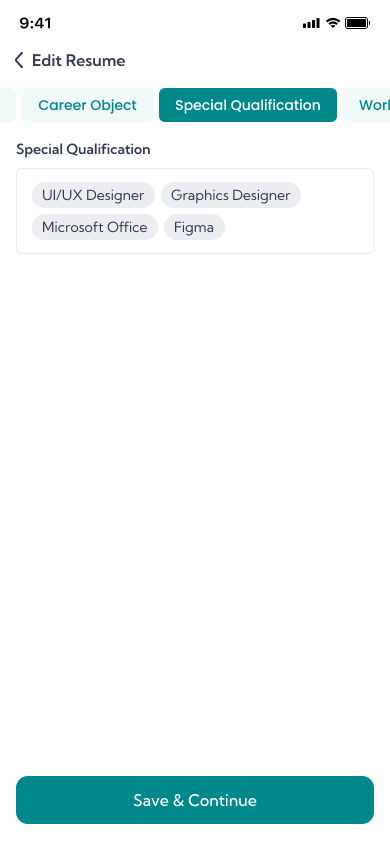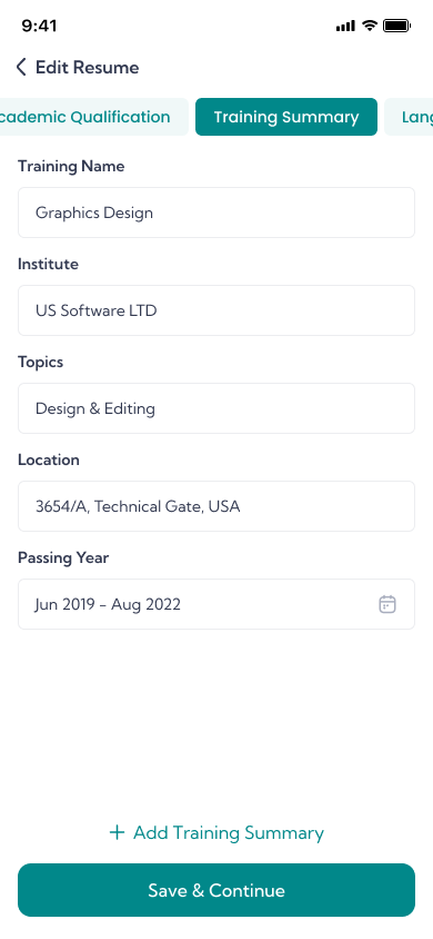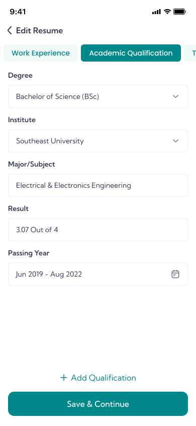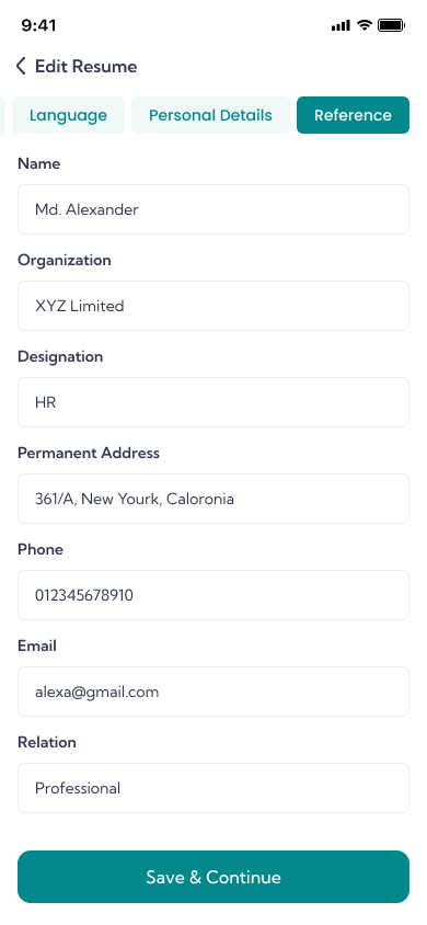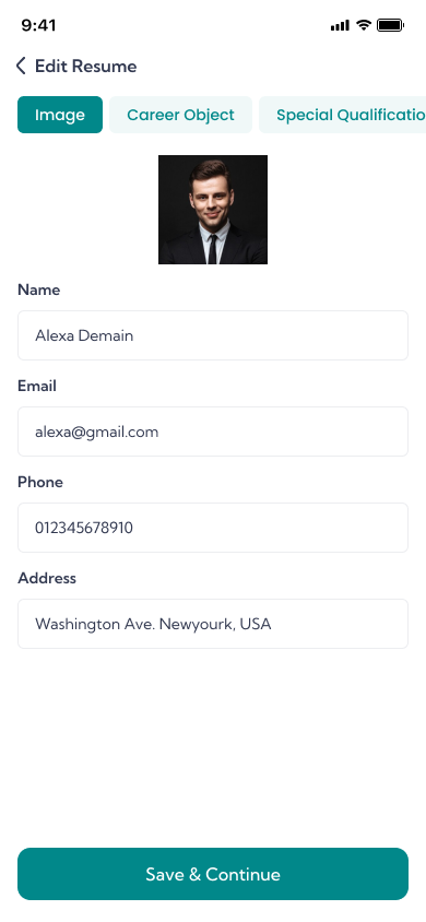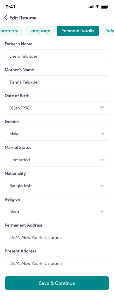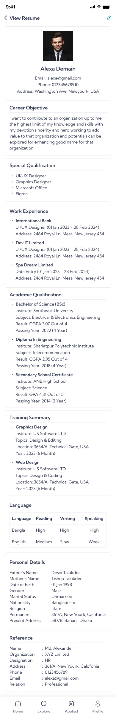 • Applicant can create their own CV from app, this is the applicant personal information for resume show.