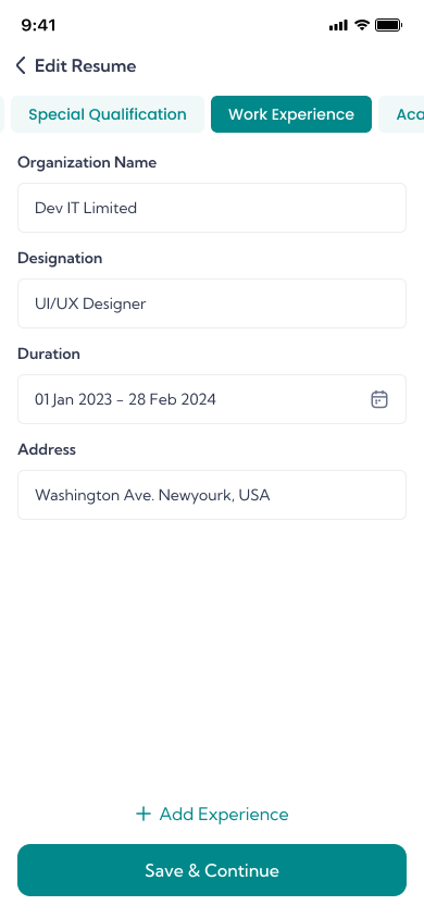 • Applicant can have multiple work experiences, here applicant can entry his multiple work experiences.